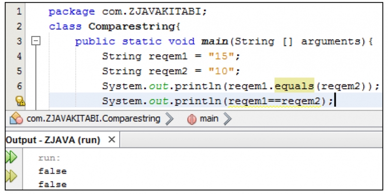 Bu zaman “.equal()”metodundan və ya “==” qoşa bərabərlik operatoundan istifadə edirik. Nəticədə gördüyünüz kimi cavab “False”(fols) yalnışdır. Əgər bərabər olsa idi “True”(tru) doğrudur olacaqdı.