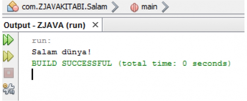 RUN düyməsini sıxmağınız yetərlidir. NetBeans-in daha bir üstünlüyü ondadır ki, yaddaşa verdiyiniz bütün fayllar avtomatik olaraq compile olunur. Proqramın sətirlərini düzgün yazdığınız halda aşağıdakı nəticəni əldə edəcəksiniz. Əgər hər hansısa bir səhv varsa sadəcə sətirləri yoxlayın. Nöqtə vergül və ya adların eyni yazılması kimi səhvlər tez-tez təkrarlanır.