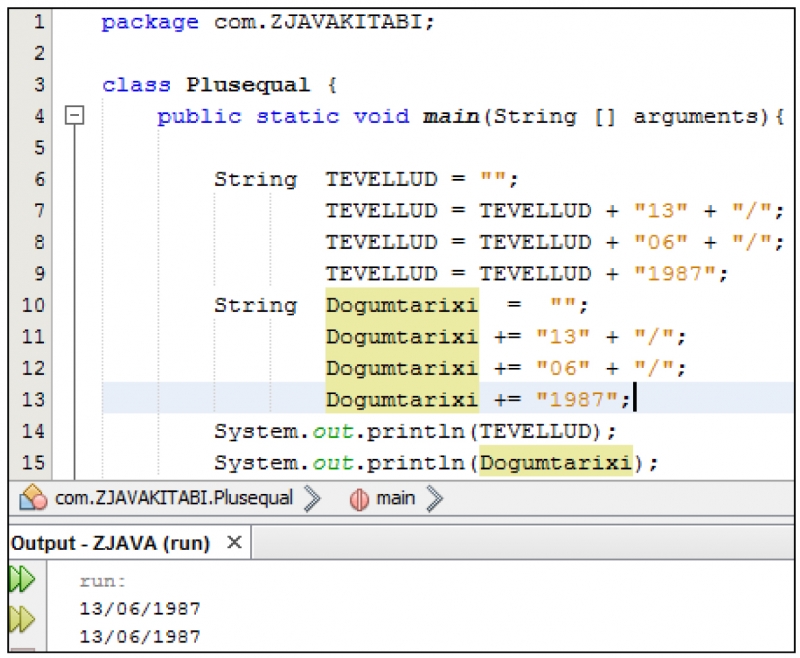 Yuxarıda göstərilən misalda “TEVELLUD” deyişəninin təkrar-təkrar yazıldığını görürsünüz. (+=) operatoru isə “Dogumtarixi” dəyişənini daha az təkrar etməklə nəzərdə tutulmuş məsələni həll edir.