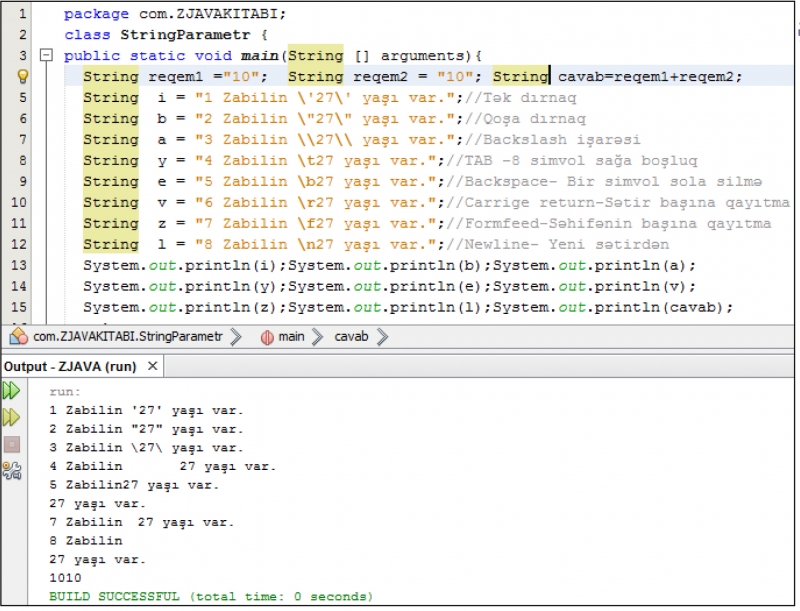 Bildiyimiz kimi String dəyişəninə mənimsədilən mətnlər qoşa dırnaq daxilində yazılır. Bəzən mətnin daxilində qoşa dırnaq və digər funksiyalar lazım gəlir, bu zaman yuxarıdakı nümunədən istifadə edə bilərsiniz. String-in müxtəlif funksiyaları mövcuddur (\’ –tək dırnaq, \”qoşa dırnaq, \\- geri sləş, \t - TAB(8 simvol sağa boşluq), \b - Backspace(bəkspeys - bir simvol geriyə, sola pozma), \r - Carrige return(kəric ritörn- sətirbaşına qayıtma), \f - Formfeed (formfid - formanı doldurma printerlərdə istifadə olunan köhnə funksiyadır, demək olar java-da istifadə olunmur), \n –Newline(nyulayn- yeni sətir)).